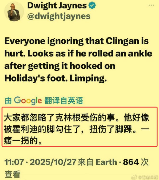根据德怀特·杰恩斯的爆料,他说开拓者队的首发中锋克林根,在对阵快船队的比赛中扭伤了脚踝,走路一瘸一拐的。